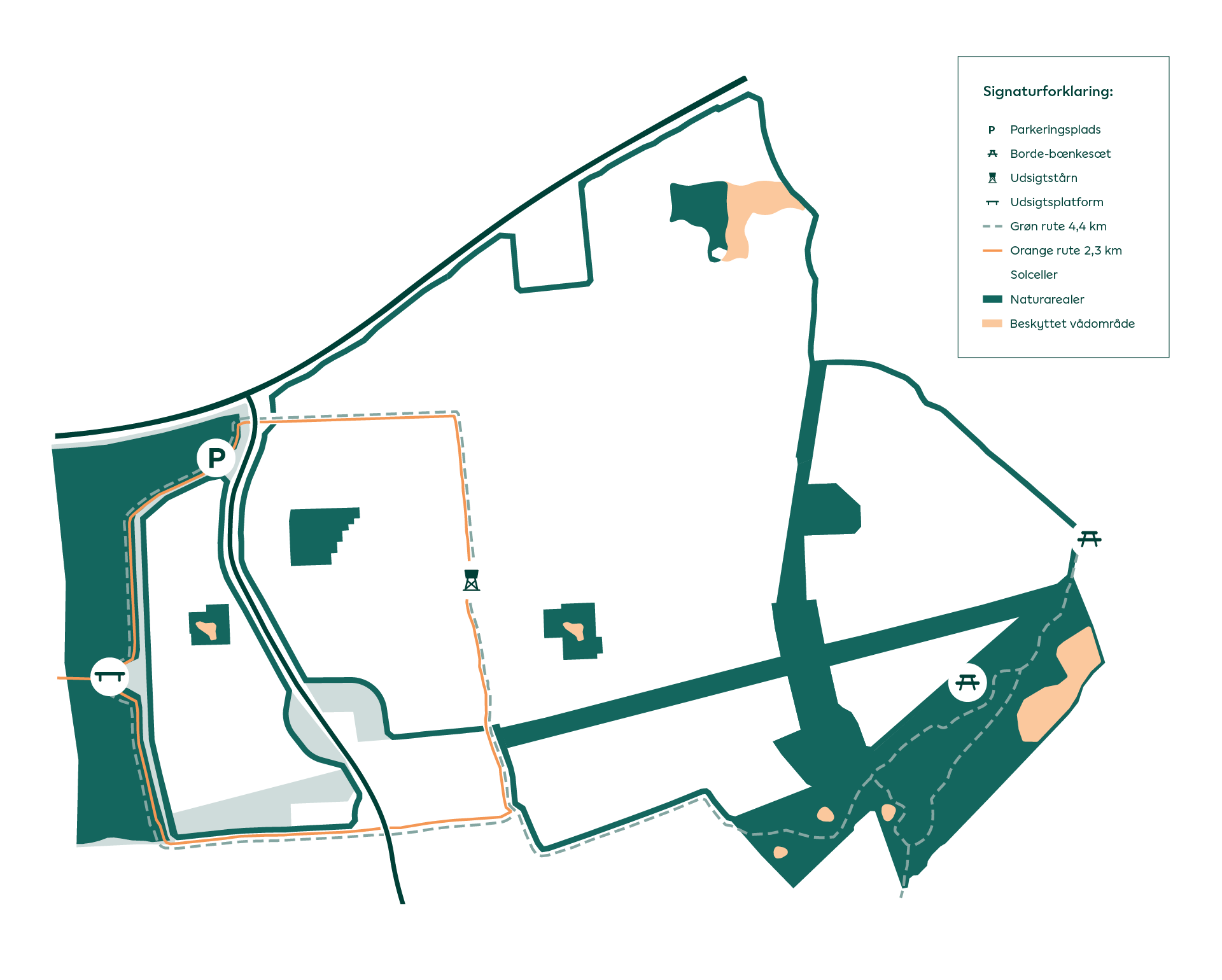Parken fungerer samtidig som et udflugtsmål med både vandre- og løberuter og udsigtstårn. Ved solcelleparken finder du: